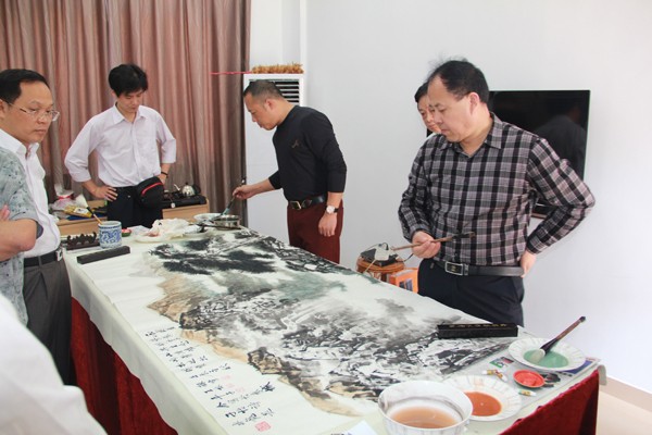 揭牌仪式结束,举行基地开笔创作仪式,惠州学院杨子怡教授吟诗一首,戴振宇院长、王林副院长、张平子副院长挥毫创作,著名书法家黄水龙题字,创作了一幅六尺山水国画,将由中国水墨研究院广东创作基地收藏展出。